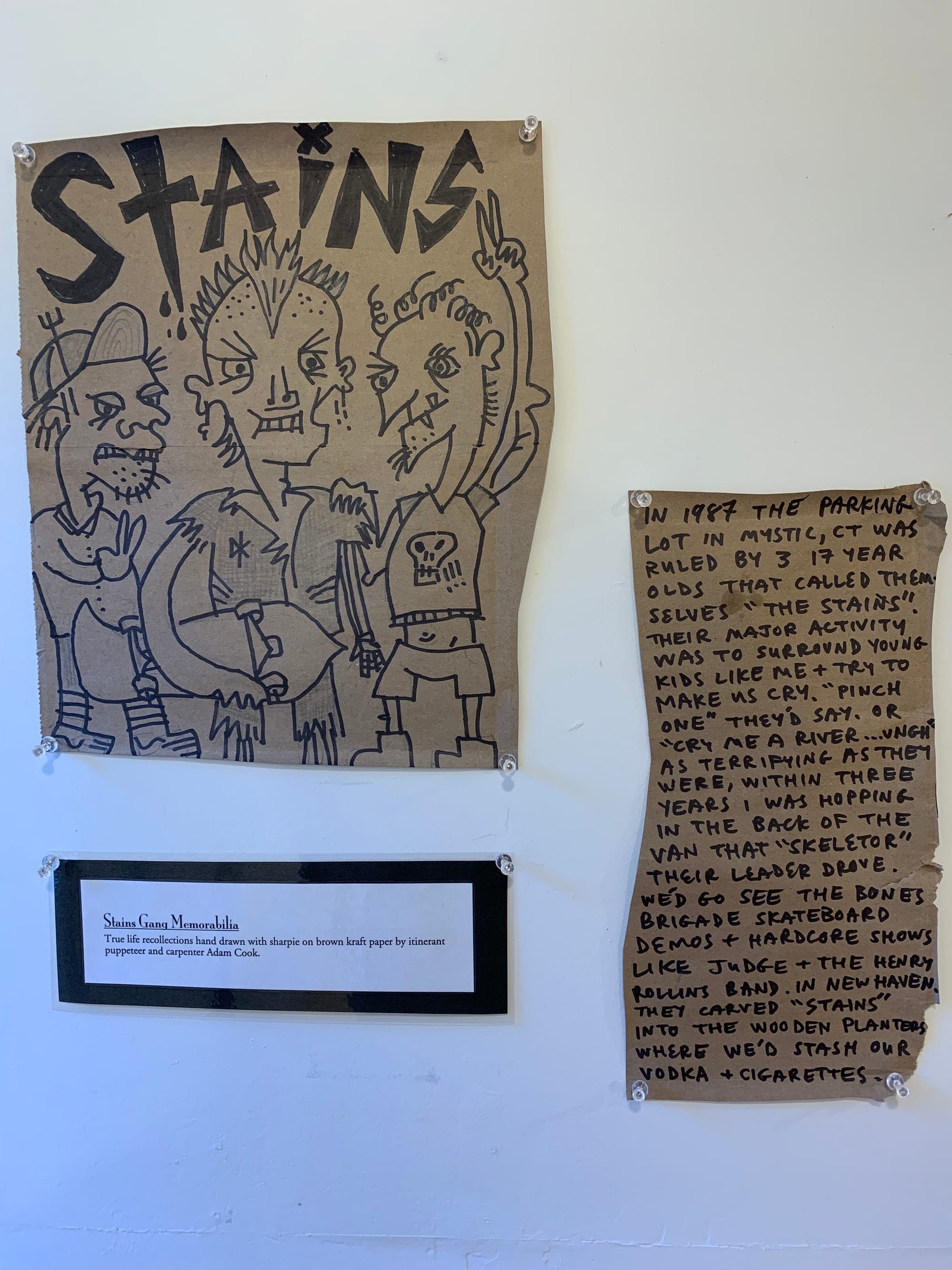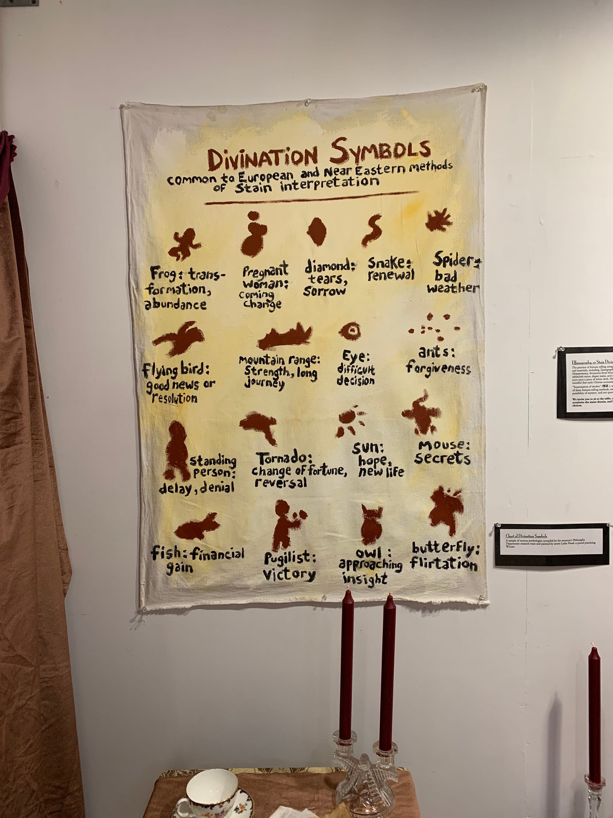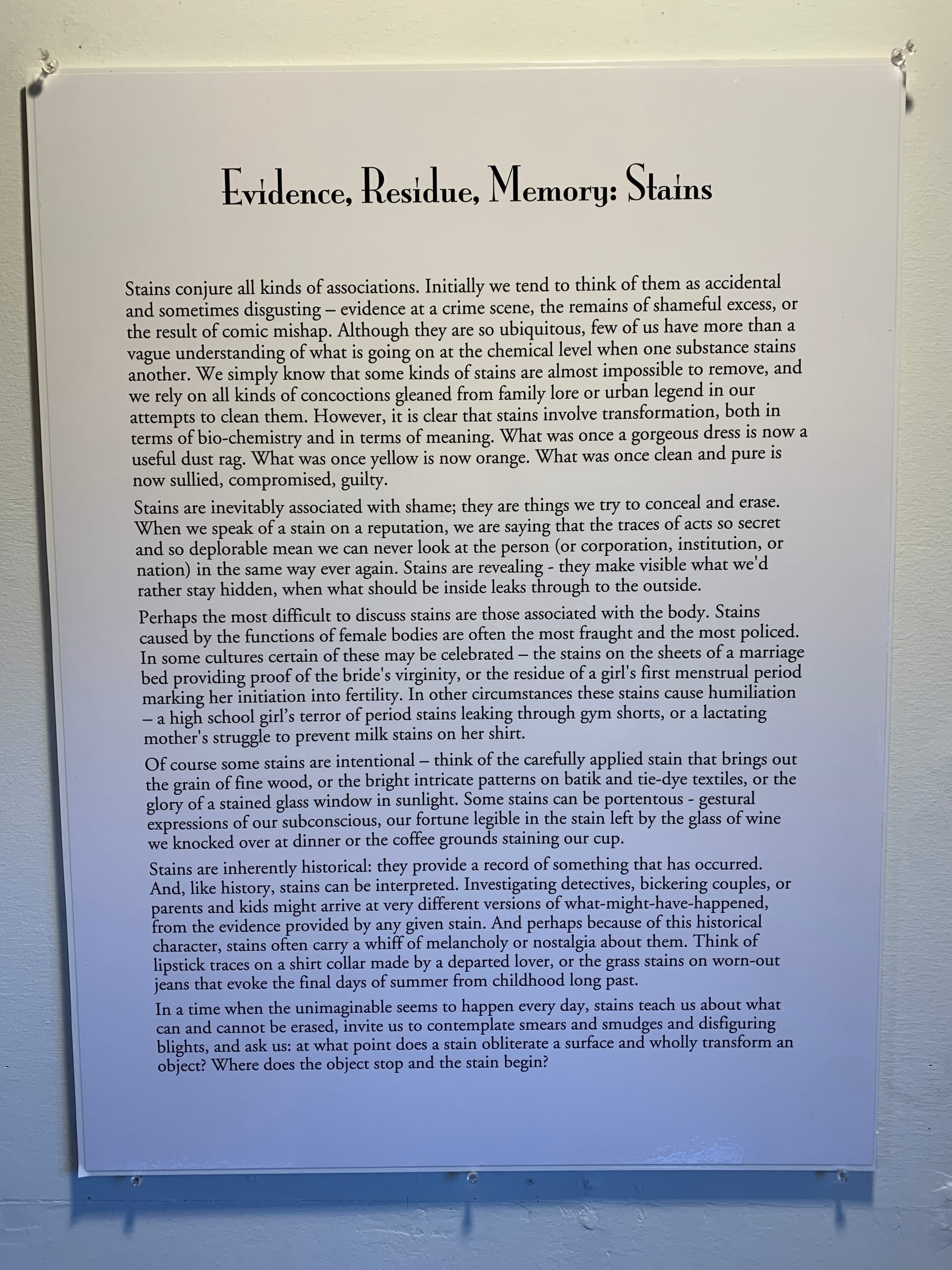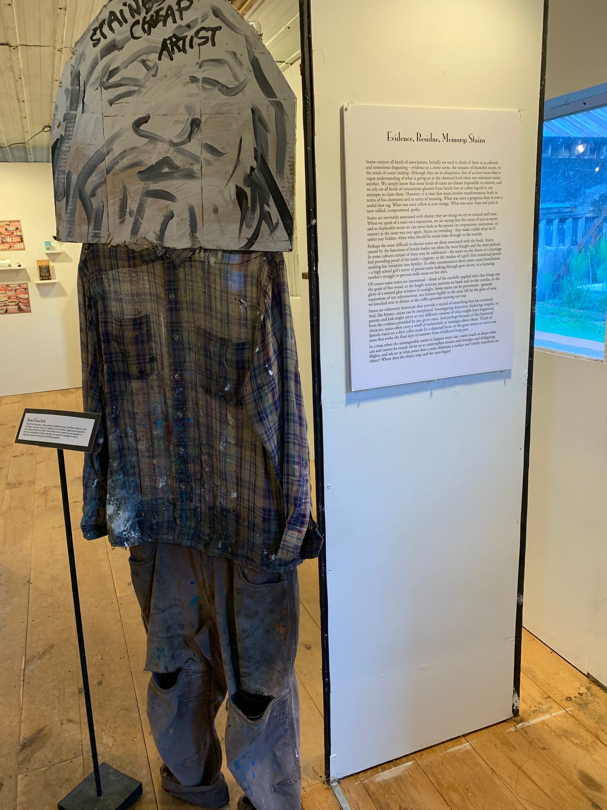 We've been to the Museum many times since I have started coming up to Vermont with Nat in 2018, so the reason we stopped by last week was specifically to check out their newly opened exhibit: "Evidence, Residue, Memory: Stains". You would think this was boring theme or that you could walk through quickly and look at a bunch of stained clothes and get the vibe - but you would be so wrong! This exhibit was carefully curated with beautifully written plaques/artist statements and some of the pieces made me genuinely emotional. The sign at the front of the room described stains as "...involving transformation, both in terms of bio-chemistry and in terms of meaning. What was once a gorgeous dress is now useful dust rag. What was once yellow is orange. What was once clean and pure is now sullied, compromised, guilty." Here are some photos of some of the included pieces: