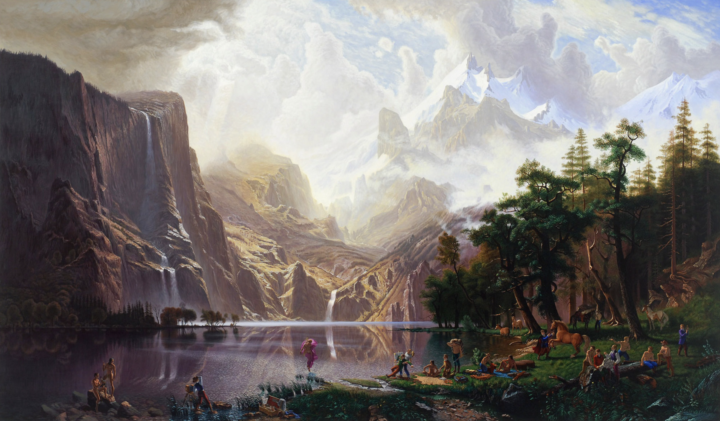 "Among the Sierra Nevada Mountains, California" (1868) by Albert Bierstadt vs "Trappers of Men" (2006) by Kent Monkman